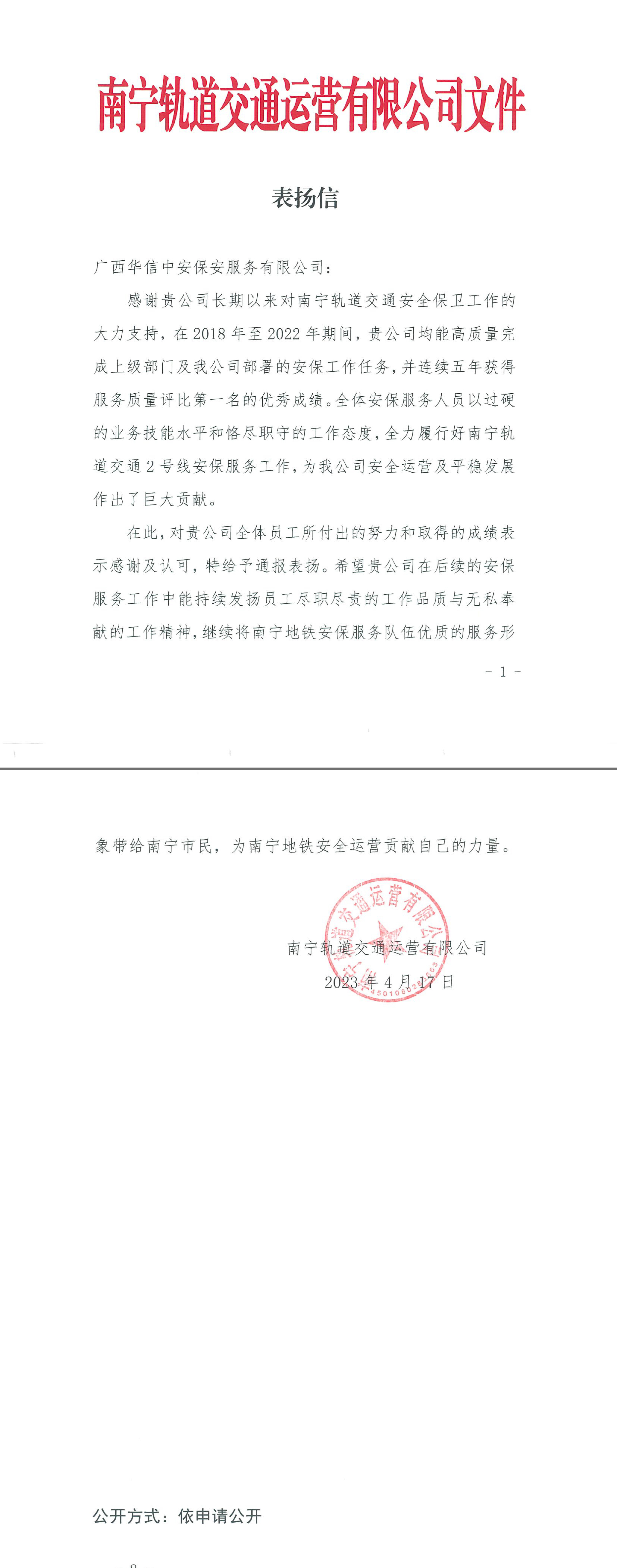 自2018年至今,广西华信中安保安服务有限公司连续五年在南宁轨道交通运营有限公司组织的服务质量评比中获得第一名的佳绩。荣誉的取得既是鞭策也是激励,未来广西华信中安保安服务有限公司将一如既往积极响应业主单位号召,共同践行“打造精益运营、成就美好出行”的运营使命,持续做好南宁轨道交通运营安保服务工作,树立南宁轨道交通优质安保形象,成为南宁轨道“城市形象新名片、城轨服务新典范”愿景的重要参与者和积极贡献者。